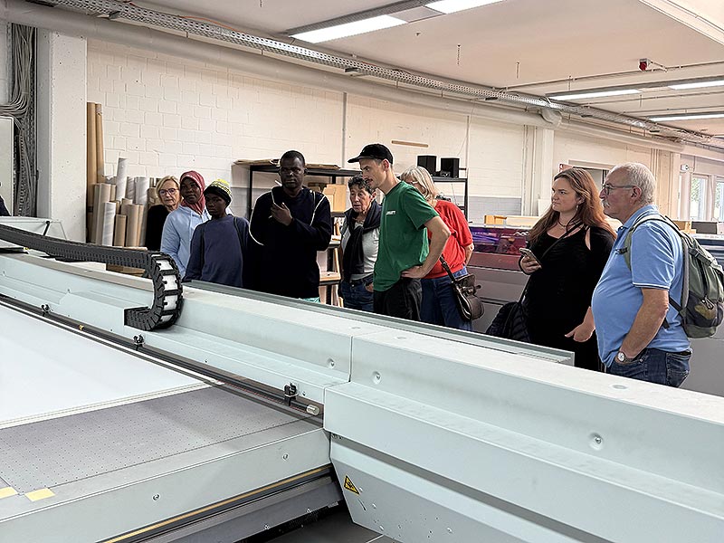 Der letzte Tag unserer Tour begann mit einem Besuch am Richard-Riemerschmid-Berufskolleg. Lehrerin Claudia stellte uns das Konzept der Schule vor, die für ihre praxisnahe Ausbildung bekannt ist. Besonders herzlich wurden wir in der Klasse der angehenden Technischen Konfektionäre empfangen. Zwischen Nähmaschinen, Schnittmustern und Stoffbahnen entwickelte sich ein lebendiger Austausch – über Materialien, Arbeitsweisen und die Stoffe, die unsere Gäste aus Burkina Faso mitgebracht hatten. Fachgespräche, Staunen, gemeinsames Lachen – der Vormittag verging wie im Flug.