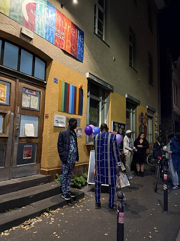 Der Höhepunkt des Tages wartete jedoch am Abend: Im Erzählcafé des Allerweltshauses in Köln-Ehrenfeld, organisiert von Edith, berichteten unsere Gäste vom Alltag in ihrem Dorf und vom Leben in Burkina Faso. Der Raum füllte sich mit sehr vielen interessierten Gästen, es gab regen Austausch, Fragen und Geschichten – auf Deutsch, Französisch und in Mooré, einer der Landessprachen von Burkina Faso. Ein Abend voller Lebendigkeit und Vielfalt, bei dem auch Kunstgegenstände verkauft wurden, die unsere Gäste mitgebracht hatten.