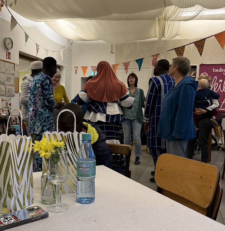 Der Höhepunkt des Tages wartete jedoch am Abend: Im Erzählcafé des Allerweltshauses in Köln-Ehrenfeld, organisiert von Edith, berichteten unsere Gäste vom Alltag in ihrem Dorf und vom Leben in Burkina Faso. Der Raum füllte sich mit regem Austausch, Fragen und Geschichten – auf Deutsch, Französisch und in Mooré, einer der Landessprachen von Burkina Faso. Ein Abend voller Lebendigkeit und Vielfalt, bei dem auch Kunstgegenstände verkauft wurden, die unsere Gäste mitgebracht hatten.